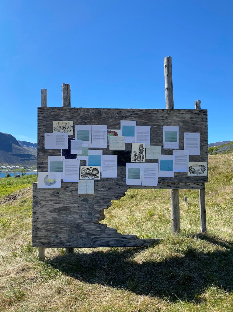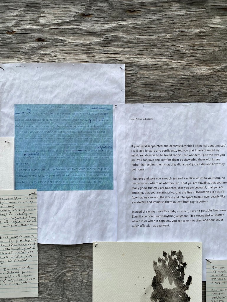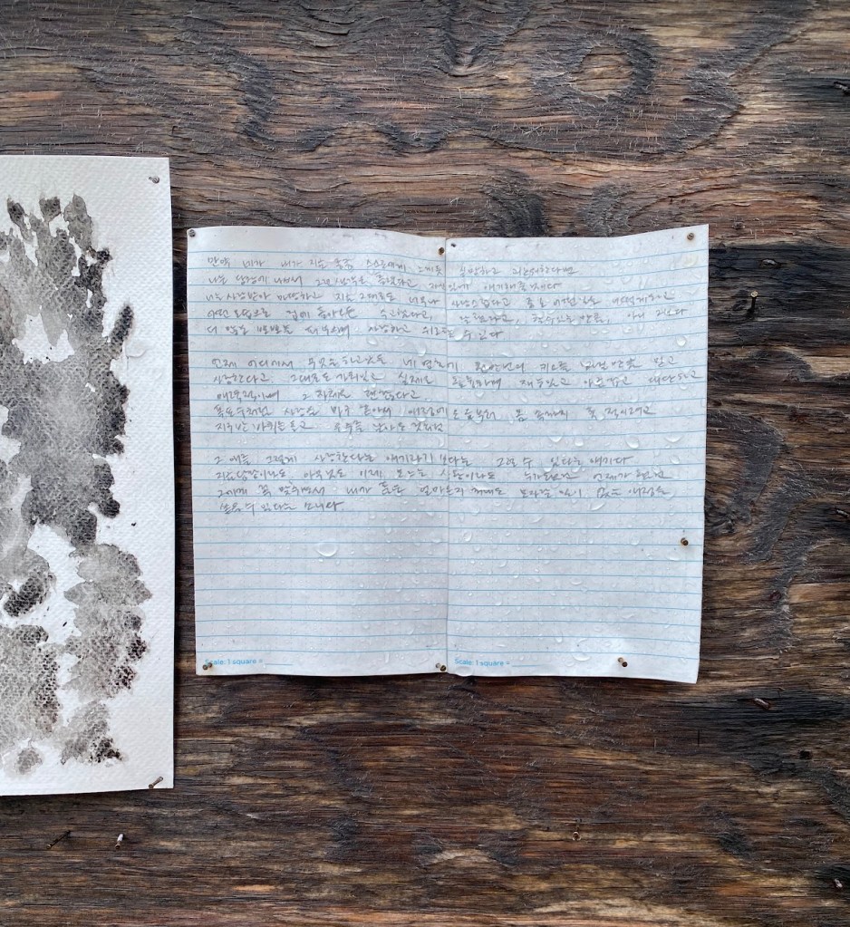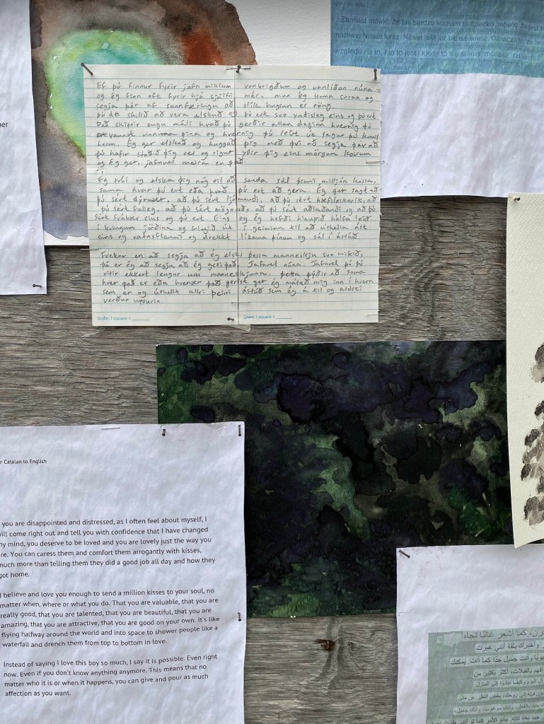 The work consists of printed images of auto-translation with corrections by the people along with handwritten original text in Korean, translated text in English, and Icelandic text (translated by Elísabet Gunnarsdóttir), which are in pencil on weatherproof papers. Small watercolour drawings depicting colour and details from the nature of Ísafjörður also added in between the texts.