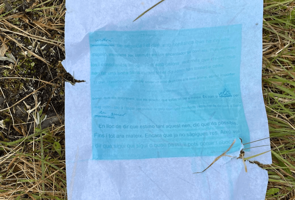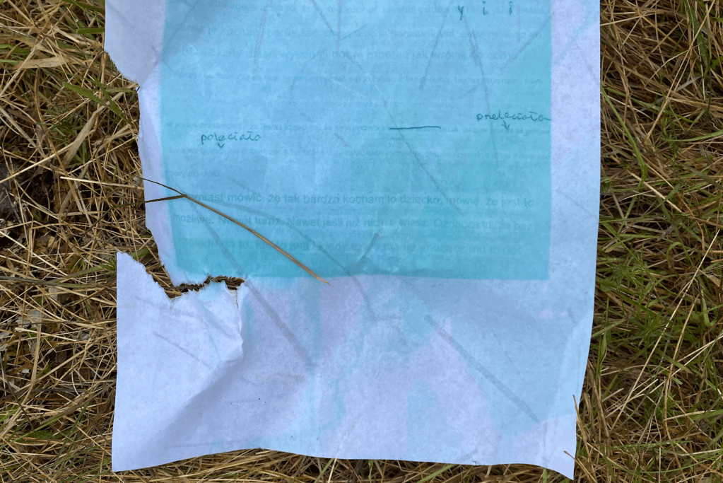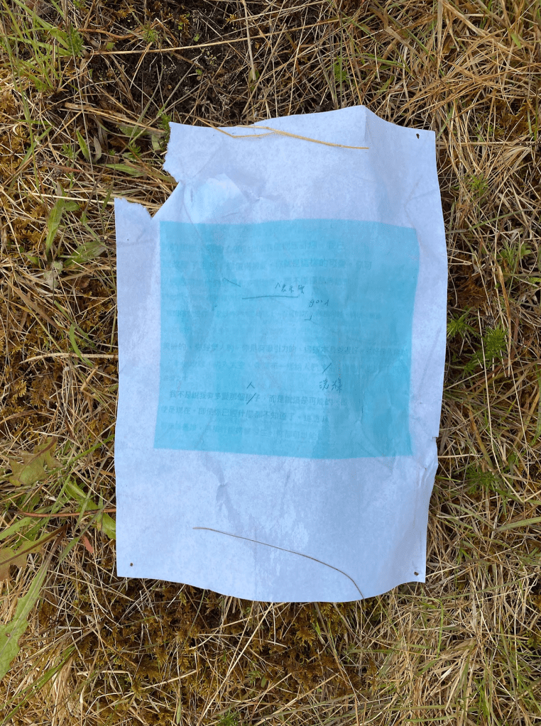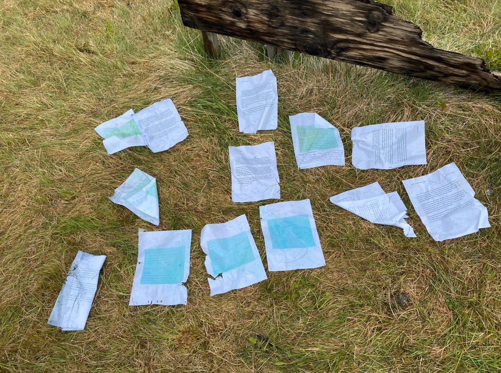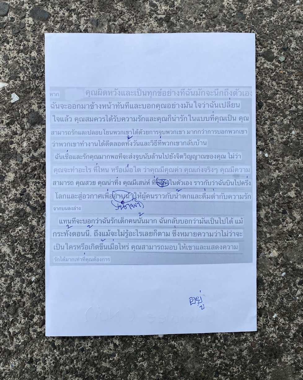 All were displayed on the board in the middle of the field for 12 days. As the weather changed the display also changed its contents. Raindrop made the printed letters fade and left the corrected part clearer. As it was wet and blown by wind, some papers were torn and got dirt and left their time on the surfaces. Such experienced papers were removed and new drawings were added from time to time while it was there.